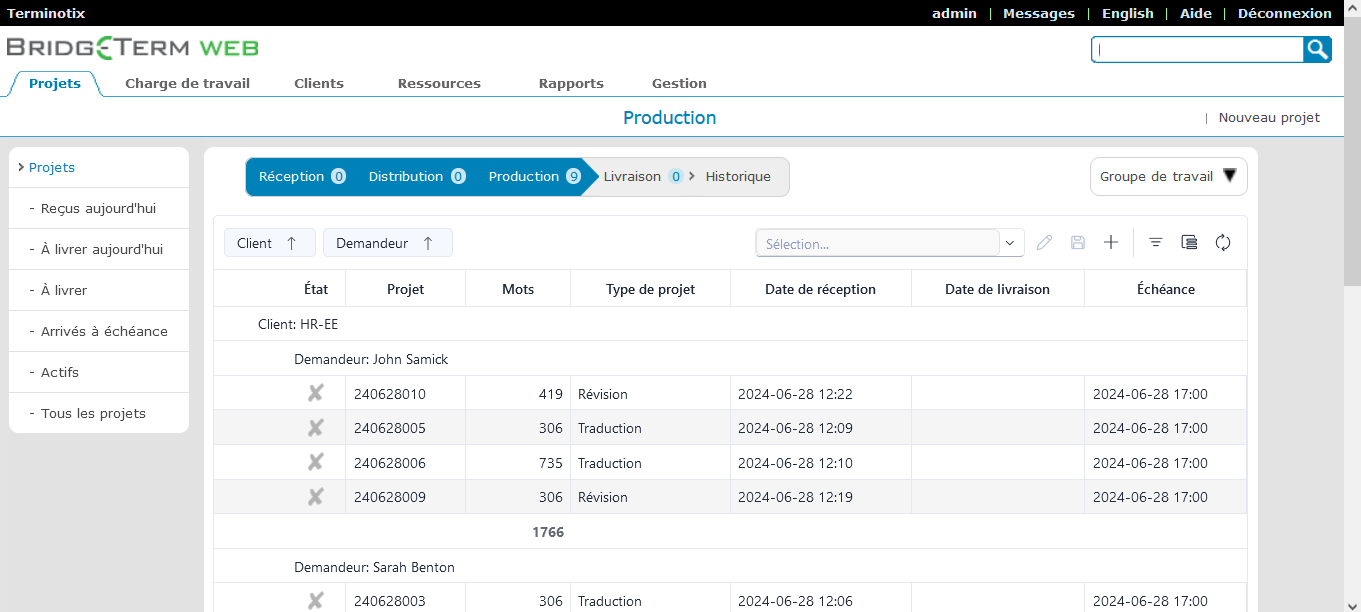At a glance, see how many projects are ongoing and their status: reception, distribution, production, delivery, approval or invoicing.