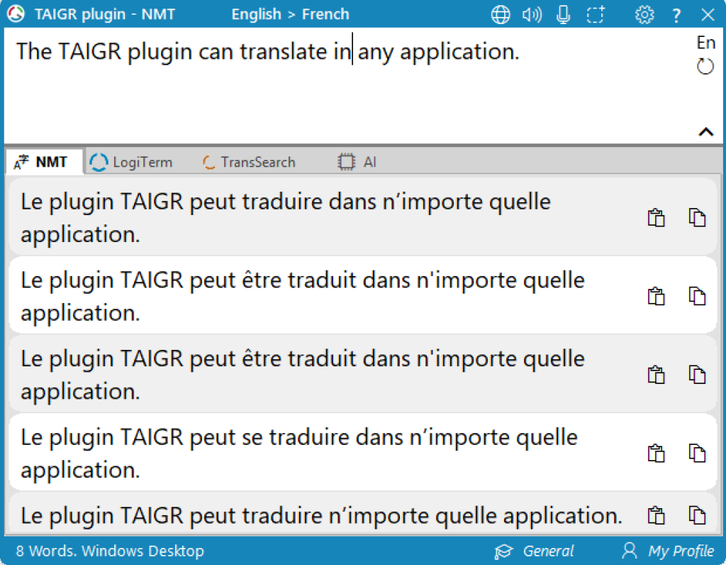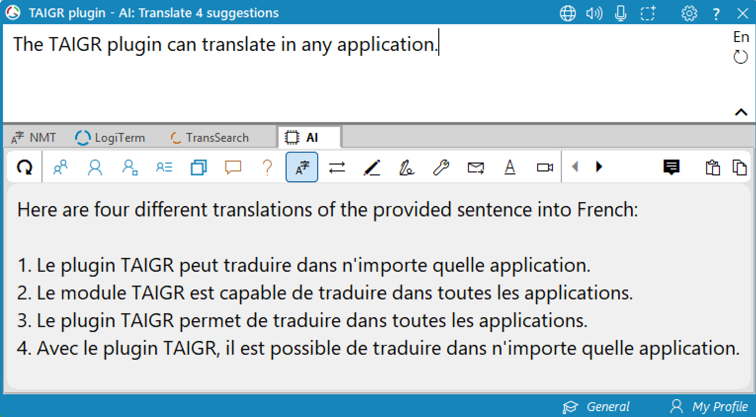 Step into the world of effortless translation with the TAIGR plugin, a sleek add-on. It instantly displays results from your bitexts, terminology, neural machine translation engines, TransSearch and artificial intelligence through TAIGR. It's like your personal language assistant, helping you translate faster and more accurately.