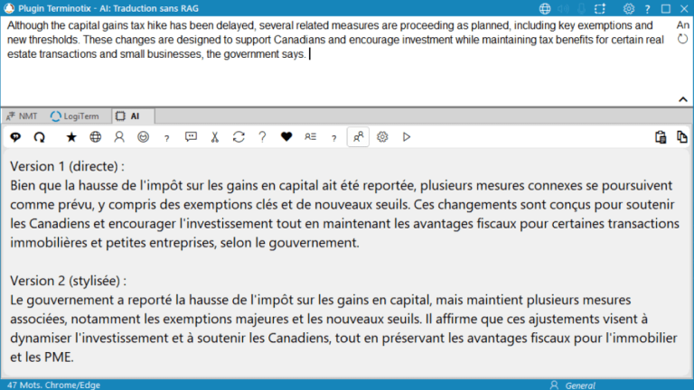 TAIGR is a paradigm shift from past machine translation engines, which are generic and overly literal. It can propose one or more high-quality drafts that respect your style guidelines. That’s where your expertise as a translator comes in: choose the best option, refine it to accurately convey each nuance, and transform it into elegant text that matches the original version—or makes it even better!
