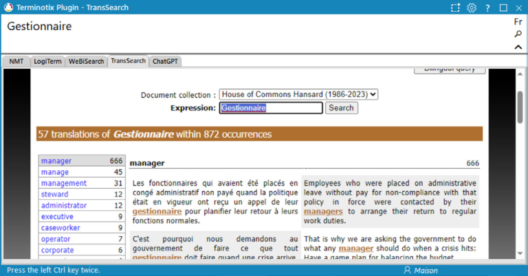 TransSearch is a bilingual online concordancer that lets you quickly search for commonly used equivalents of terms and phrases in the text of Canadian House of Commons and Senate debates (Hansard corpus), as well as the text of rulings from Canadian courts and the International Labour Organization. Its databases contain over 500 million words in total.